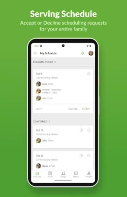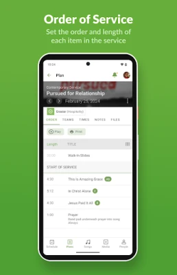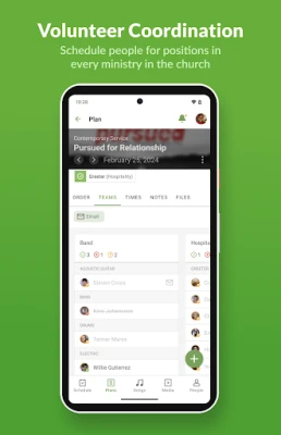 With our native Android app, you get an optimized Planning Center Services experience wherever you are! You can manage your schedule, accept or decline requests, blockout dates, or upload your profile picture. Musicians can use the built-in media player or attachments section to access and rehearse their music. Schedulers can add users to schedules, check for conflicts, and email their teams at any time. Easily add to, reorder, and edit your plans.