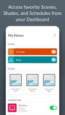 • Add favorite Scenes, Shades, and Schedules to your Dashboard, so they appear first whenever you open the app.